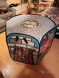 Tenda a forma di castello per bambini, tre entrate e un'uscita dall'alto, per interni. Si piega molto facilmente passando da un rombo ad un rettangolo spesso pochi centimetri e alto 4 spanne. L'articolo è in ottime condizioni, può risultare solo usurato nei bordi a contatto con il pavimento.
