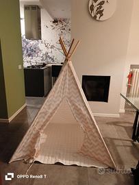 Bellissima tenda per bambini in cotone doppio strato e legno di pino,materiali naturali,con tappetino antiscivolo.Usta poco,pari al nuovo con lucine a stella che si possono usare o meno a seconda dei gusti.Altezza 155, lunghezza 120, profondità 120