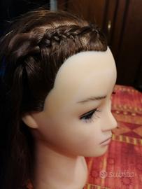 Testina per giocare alla parrucchiera con capelli sintetici, con gancio per fissarla al tavolo.