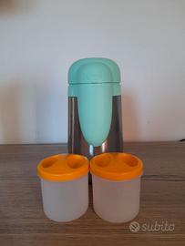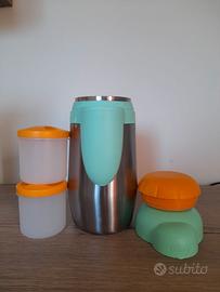 Thermos per trasporto e conservazione del cibo, completo di 2 contenitori e tappo multifunzione (che può essere utilizzato come ciotola, come illustrato sulla confezione). Molto pratico per portare la pappa in viaggio. Mantiene bene la temperatura e può essere usato anche per trasportare altri alimenti o bevande, come frutta, succhi, ecc.