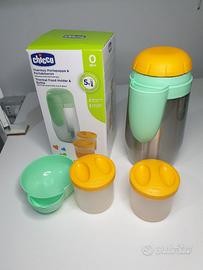 Utilissimo, con 2 contenitori per pappa, in acciaio inox; mantiene la temperatura (caldo o freddo) per 5 ore. Puo' anche ospitare il biberon del bambino. Il coperchio e' utilizzabile come tazza o porta posate.