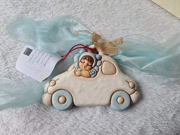 Coccarda / fiocco nascita in ceramica del marchio Thun a forma di automobilina su cui si può scrivere il nome del bambino con un pennarello. Corredata di scatolina, carta regalo, rafia per chiudere la confezione, biglietto di auguri e busta in carta( leggermente sgualcita). Misure: lunghezza 13 cm x altezza 9cm.