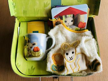 Set valigetta bimbo mini: tazza in porcellana, tovagliolo in spugna con coniglietto e gioco a schede.