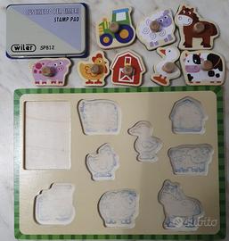 Scatola originale con timbri in gomma con supporto in legno come da foto. Base in legno e cuscinetto per timbri non originale. Consegna solo a mano.