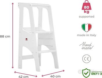 - Realizzata a mano in legno eco-friendly, alta qualità artigianale made in Italy; - Design leggero, semplice da maneggiare e al contempo robusta e sicura per il bambino. Può sostenere fino a 80 kg; - Regolabile in 3 posizioni, segue la crescita costante del bambino fino ai 7 anni d'età; - Misure della torre presenti in foto; - Facilmente smontabile, è presente la confezione originale. NO SPEDIZIONE