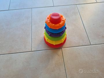 Il gioco include una base oscillante e 6 anelli impilabili, colorati e di diverse dimensioni