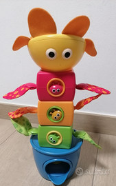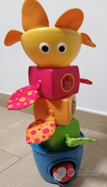 Torre Flap Flap: Giocattolo multiattivita' con 5 pezzi da sovrapporre. La pallina esce a caso da una o dall'altra apertura. Quando la pallina cade dalla pila emette suoni e le ali si muovono. I blocchi della pila emettono suoni e scatti. Gioco ottimamente tenuto e perfettamente funzionante. Solo il disegno sulla pallina è un pochino rovinato.