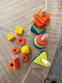 Vendo torre impilabile in legno. Marca playtive junior. Varie forme e colori, 3 torri. Con scatola originale. Alle 3 forme finali sono state disegnate le facce.