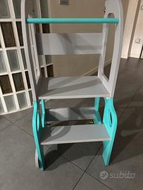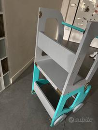 Bella e pratica torre montessoriana 2 in 1. Si può usare sia come classica torre di apprendimento, portando il bimbo ad altezza genitore per effettuare attività con gli adulti, sia come tavolino, scrittoio, per gioco, disegno o per effettuare i pasti. Pieghevole con seduta incorporata. Normale segni di usure quotidiane