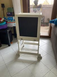 Torre Montessoriana per bambini, bianca. Presenta come da foto adesivi rimovibili. I piedi sono stati rinforzati. La lavagna è rimovibile. Come da foto n 5 il tavolino risulta leggermente macchiato di colore.