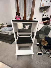 Learning tower Montessori con finitura bicolore trasformabile in lavagna, tavolino, pedana e scrivania
