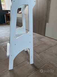 Torretta di apprendimento montessoriana con tre livelli di altezza, sia per il piano che il gradino. Sicurezza posteriore anticaduta.