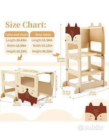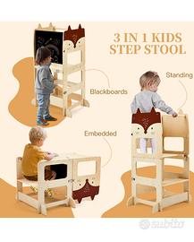 Torre di apprendimento in legno per bambini con lavagna, trasformabile in tavolino con seduta.