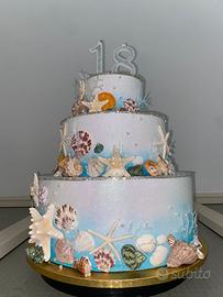 torta in gomma eva glitterata dipinta sfumata a mano,con conchiglie e stelle marine, perline, coralli realizzati a mano e filo di strass, usata per 18esimo, altezza e larghezza circa 45cm,prezzo trattabile