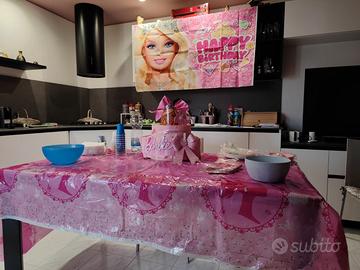 Vendo torta porta merenda senza n.4, tovaglia, poster e palloncini addobbi compleanno Barbie.