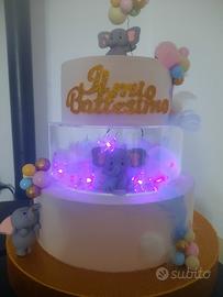 Torta in gomma eva per battesimo bambina... base centrale trasparente con luci alimentate con piccolo pannellino solare... molto scenografica...