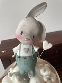 Bellissima torta finta, con coniglietto e nuvola. Stelline decoratobd e strati a volant . Perfetta . Solo un piccolo pezzetto di volant si è spezzato, come si vede in foto. Perfetta per conpleanno o battesimo.