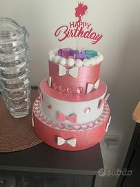 Torta da pricipessa in polistirolo completamente coperat com pait brillantinato in colori alterni diamanti puff accessori e decorazione alta.
