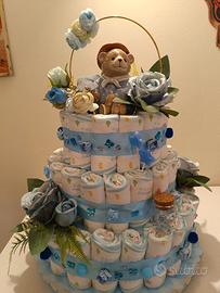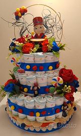 Si confezionano torte interamente di pannolini con peluche, carillon, salvadanaio e abat-jour in porcellana per bambino/bambina... anche personalizzate.