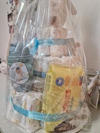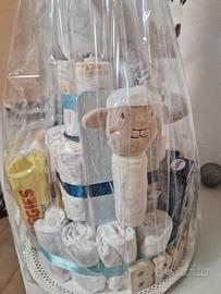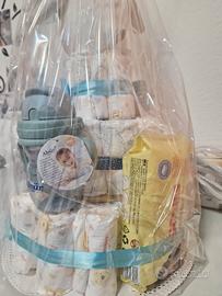 Si realizzano torte pannolini con all'interno accessori, cosmetici per il neonato, giochini e tutto quello che volete per personalizzare il vostro regalo per un nascituro o anche come regalo per un battesimo. Decidete voi in base al vostro budget tutto quello che volete mettere all'interno. Questa in foto l'ho realizzata per un bimbo appena nato i pannolini sono Hugghies seconda misura taglia 3/6 kg. Chiedete per informazioni risponderò in breve tempo. Posso realizzarla in 24 ore.