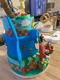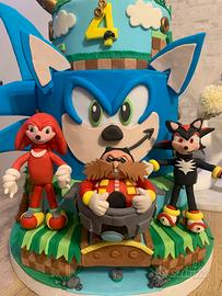 Torta in pasta di zucchero , con basi in polistirolo. Personaggi fatti completamente a mano ad esclusione di sonic blu nel cerchio che in plastica ed includo nel prezzo . Il cerchio si illumina .