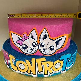 Torta decorativa a due piani, perfetta per feste a tema Me contro Te. Realizzata in polistirolo e decorata con glitter e personaggi.