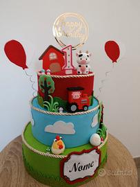 vendo torta decorativa nuova a tema animali della fattoria, a tre piani con tanti dettagli e animali candela numero 1 e con la possibilità di aggiungere il nome del festeggiato personalmente