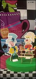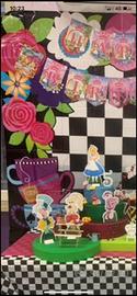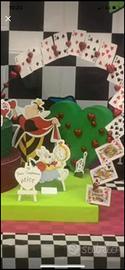 Vendo Torta scenografica Alice nel Paese delle Meraviglie: composta da: torta centrale a 3 piani - a dx guardino della Regina di Cuori con cuore e arco di carte - a sx tavolo per il momento del te con tutti i personaggio come da foto con possibilita di spostarli a proprio piacimento.
