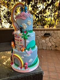 Torta scenografica, no commestibile. Struttura in polistitolo. Rivestimento in gomma eva e decorazioni in pasta modellabile. Arcobaleno in macramè Inserti in porcellana fredda