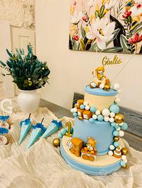Torta scenografica panna e celeste Diametro 38 cm circa Altezza 55 xm circa Nome e candelina sostituibile Realizzata per battesimo e primo comoleanno
