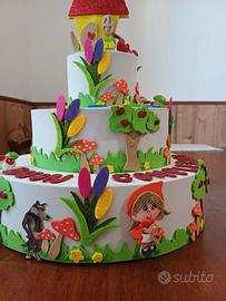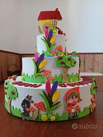 Finta torta di compleanno con base in polistirolo e decorazioni in gomma eva con glitter. Per bimbi, tema Cappuccetto Rosso