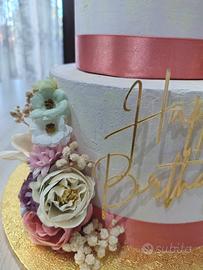torta scenografica in stucco. effetto finta panna con fiori. possibilità di cambiare il numero.