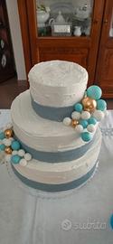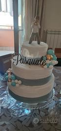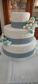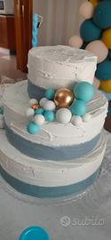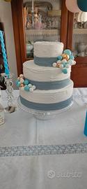 vendo torta scenografica in stucco, tre piani di polistirolo ricoperti con stucco bianco spatolato, effetto panna,completa di nastrino e decorazioni a palloncino (escluso statua bambino e nome)