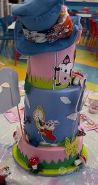 Torta scenografica per compleanno tema “Alice nel paese delle meraviglie “ interamente fatta a mano . Il cappello è in velluto cucito a mano .