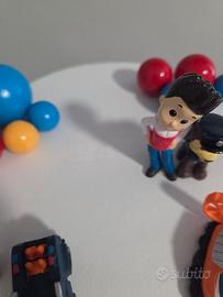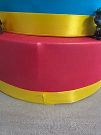 Torta in stato perfetto, unici difetti cerchiati in foto e nella parte davanti perche il polistirolo non era omogeneo. Ovviamente viene coperto dallo scudo in cartoncino attualmente staccato per poter far applicare il nome piu facilmente. Piccolo difetto nella parte alta (sempre cerchiato) perche il numero in legno ha leggermente lasciato il segno per il nastro biadesivo. Paw patrol tutti inclusi perche incollati.