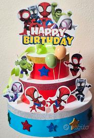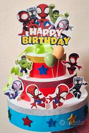 Vendo torta finta scenografica a tema Spider-Man / Marvel Supereroi, realizzata in polistirolo e cartoncino.