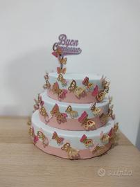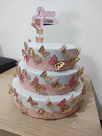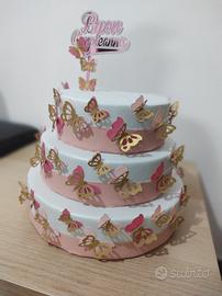 Bellissima torta finta a tre piani, a tema farfalle. Perfetta per compleanni o eventi speciali!