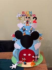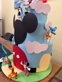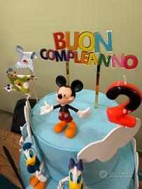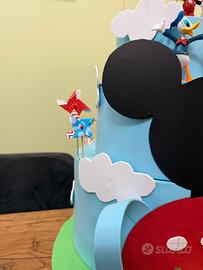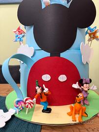 Torta scenografica in gomma Eva tema Topolino e gli amici di club house (Mickey Mouse, Paperino, Paperina, Minnie, Pippo e Pluto) candela numero 2 usata per spegnerla durante la festa.