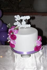 Vendo torta scenografica h. 20 cm rivestita in fommy e decorata con splendidi elementi floreali sulle tonalita vivaci del viola, lilla e glicine. inoltre è possibile effettuare un cake topper personalizzato con la scritta e il colore che si desidera.