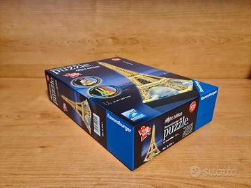 Bellissimo puzzle 3D della Tour Eiffel, che si illumina di diversi colori grazie alle luci a LED. I pezzi si assemblano ad incastro senza l'uso di colla. La confezione non è danneggiata e sono presenti tutti i pezzi