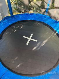 trampolino elastico con rete di protezione chiusura con cerniera (perfettamente funzionante) diametro trampolino 180 cm circa, altezza totale struttura 230 cm circa. ottimo stato usato poco e tenuto sempre al coperto sotto porticato.