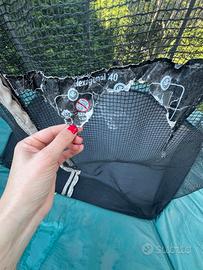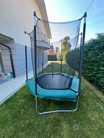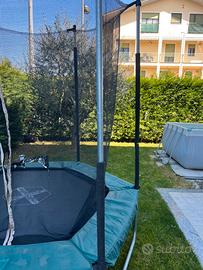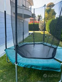 Trampolino elastico da giardino con rete di protezione, modello Domyos Exagonsl 240 marca Decathlon Dimensioni in metri: 2,4 x 2,4 x 2,52 (h). Usato ma la struttura è in buone condizioni, nulla di rotto. . Le protezioni in spugna sono un po’usurate dal tempo e dagli agenti atmosferici.