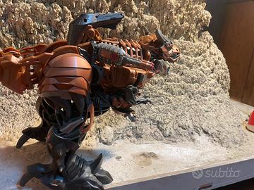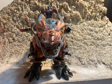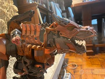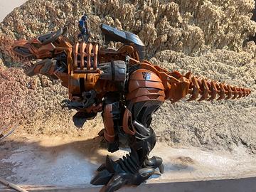 Modello della serie Transformers del film “l’era dell’estinzione”; gli si può far assumere una forma secondaria ed è provvisto di un piccolo modellino secondario del transformer “Optimus Prime”. L’articolo pur essendo usato è in buone condizioni e non presenta alcun segno di usura, se non per la mancanza di un pezzo che componeva la coda del modello e che una volta staccato fungeva da lama della forma secondaria del personaggio.