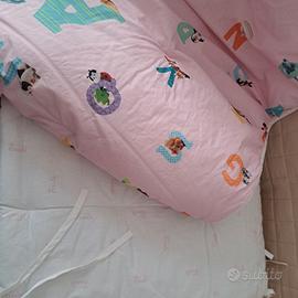Trapunta e paracolpi Trudi by Gabel. Paracolpi mai usato, trapunta come nuova, double face rosa con alfabeto e bianca con scritta trudi. Possibilità di avere anche lenzuola per lettino coordinate.