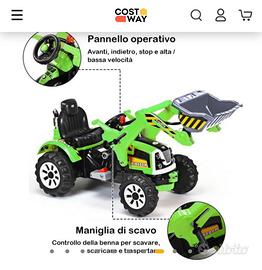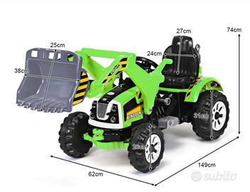 Trattore giocattolo di colore verde brillante, perfetto per il gioco all'aperto. - Caricatore frontale funzionante. - Sedile nero. - Ruote grandi con battistrada.