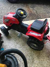 Trattore Smoby a pedali con rimorchio removibile. Sedile regolabile, cofano apribile. Volante con clacson.