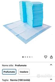 Vendo confezione di traversine utilizzabili sia per piccoli cuccioli di cane che come base per un cambio pannolino per neonati. La confezione originaria è di 100 pezzi, alcuni sono stati utilizzati ma non più di una decina. Lo stato della confezione è perfettamente intatto.