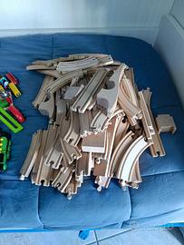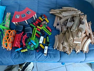 Sono circa 200 pezzi tra treni a batteria e senza, binari (rettilinei e curvi), scambiatore, deposito, ponti, etc. Circa 10 metri di pista. Tutti i pezzi in buono o ottimo stato