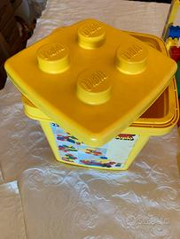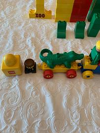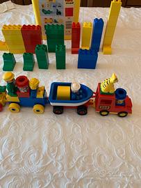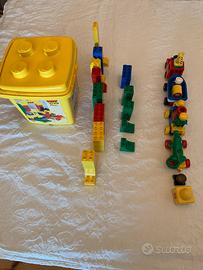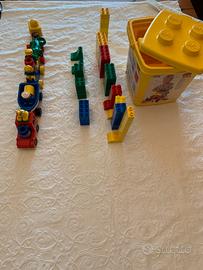 Trenino Duplo completo di secchiello compsto da n 54 mattoncini più composizioni come da foto personaggi e mattoncini