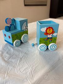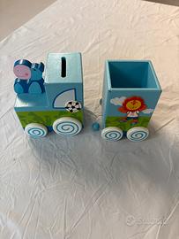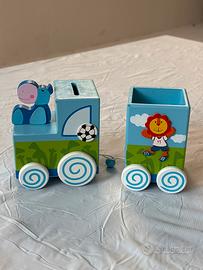Il trenino e composto da due vagoni,il primo vagone ha una fessura per le monete e una figura di ippopotamo , mentre il secondo vagone è un porta penne con una figura di leone .in omaggio il libro della giungla.